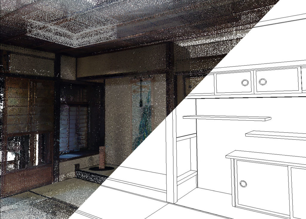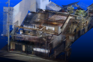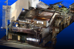 通常であればコンペティションにより対象に設定された現地を実測しなければ詳細な寸法は得られません。 今回は仮想的な町家を対象とし、点群データを提供することで、詳細な寸法を読み取ることができ、さらに経年により変化した各部の歪みまで読み取ることが可能な様にしています。 点群データにより、立体的なプレゼンテーション資料を作成可能で、モデルデータ化や他の3次元データなどを合わせることで、さらなる表現も可能なようになることから、 本コンペティションではこれらの点群データを資料として提供いたします。