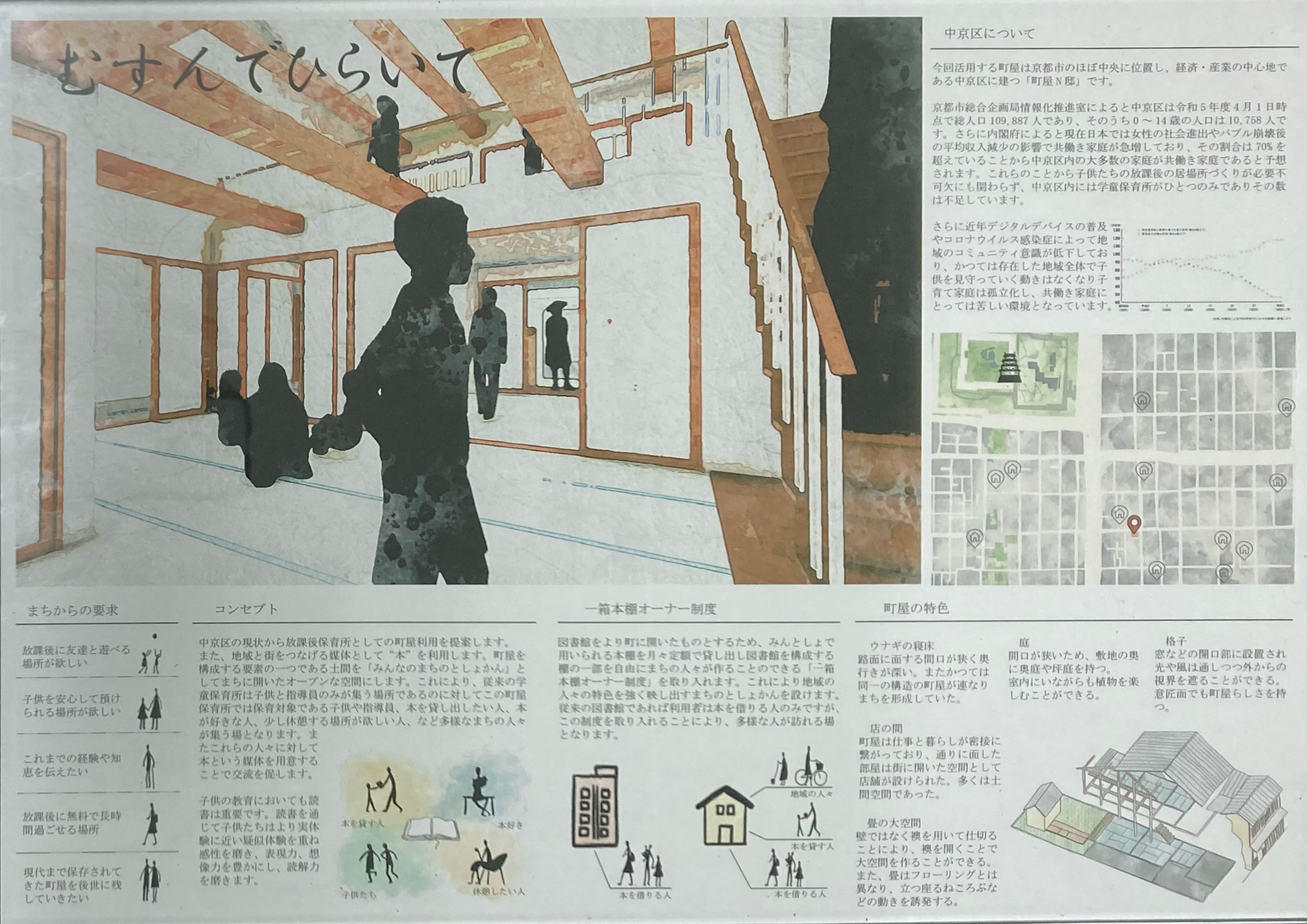 今回のコンペでは、「町家 N 邸」(京都市中京区三条に位置する)を題材に、地域の交流 施設や活動拠点、地域活性化につながる商業施設等、皆さんの自由な利活用アイデア(利活用のコンセプトやゾーニング案など)を募集します。